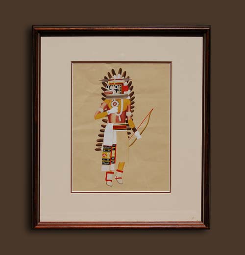 The paintings of Mootzka combine artistic quality with the true recordings of Indian life. His figures are well drawn, displaying a neat and even fragile quality. His paintings are beautifully composed. This single figure painting of a Sikyahote Kachina in traditional dance costume points to inspiration from a Plains-type warrior, particularly the full-feather headdress.
