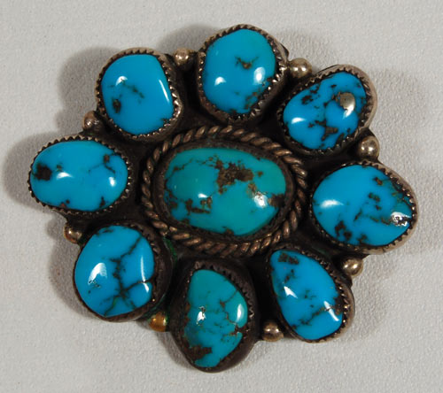 Nine absolutely beautiful deep blue (probably Blue Gem) turquoise domed cabochons have been set in silver bezels on a silver backing to form this exquisite pin. I am not expert at determining the mine of origin of turquoise but I believe these are Blue Gem stones. The beautiful sky blue color is typical of that mine.