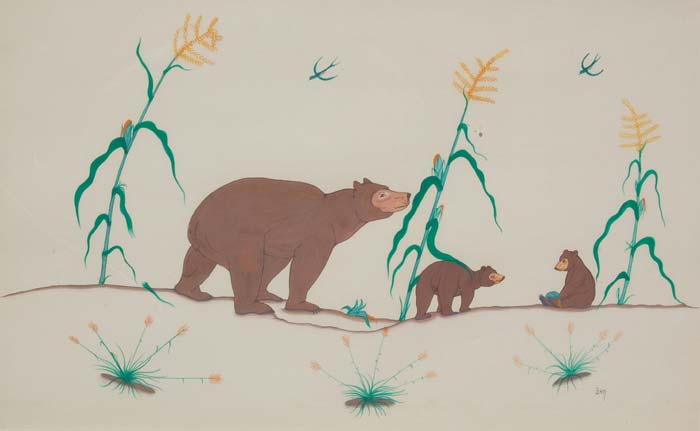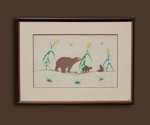 In this pleasing painting, the female bear is eyeing the activities of her cubs. One has taken an ear of corn and holding it in his lap. The other cub is watching to see what he does with it.