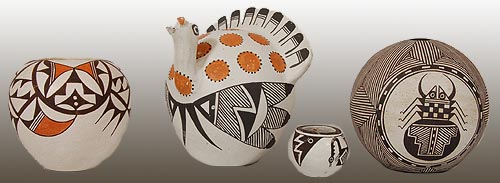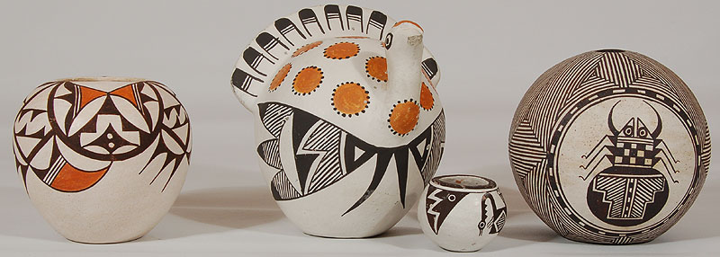 This is a group of four pieces of circa 1970s Acoma Pueblo pottery. We have decided to group them together as a single purchase for a single price. There is a miniature Black-on-white jar with Mimbres designs signed Emma (Emma Lewis, daughter of Lucy Lewis). There is a larger fine line seed jar with Mimbres figures signed G. Leno (probably related to Juana Leno), a Polychrome jar signed M. Seymour ( Margaret or Mary Ann?), and finally, a wonderful turkey figurine signed simply Acoma, NM. The turkey has lost part of its beak. The other pieces show no damage.