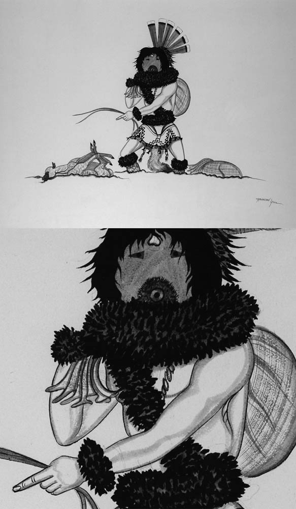In this black and white painting, likely done later in Yazz’s career, a Yei has captured a deer and is about to put it in a storage bag. Thematically, this piece is much more solemn than many of Yazz’s earlier paintings, but it is beautiful nonetheless.