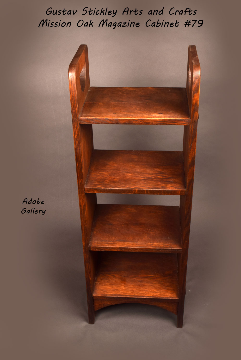 This Gustav Stickley Arts and Crafts Mission Oak Magazine Cabinet #79 functions well as a repository for Pueblo pottery. The spacing between the shelves is 8-1/2 inches.