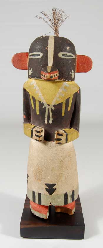 Condition: Front of left foot missing. Gouge in top of head that probably appeared in wood before carving. A stand has been added, but is removable if one prefers to hang the katsina doll from a string.