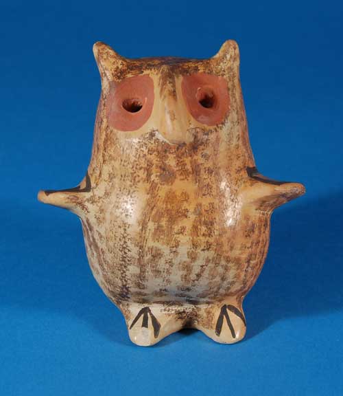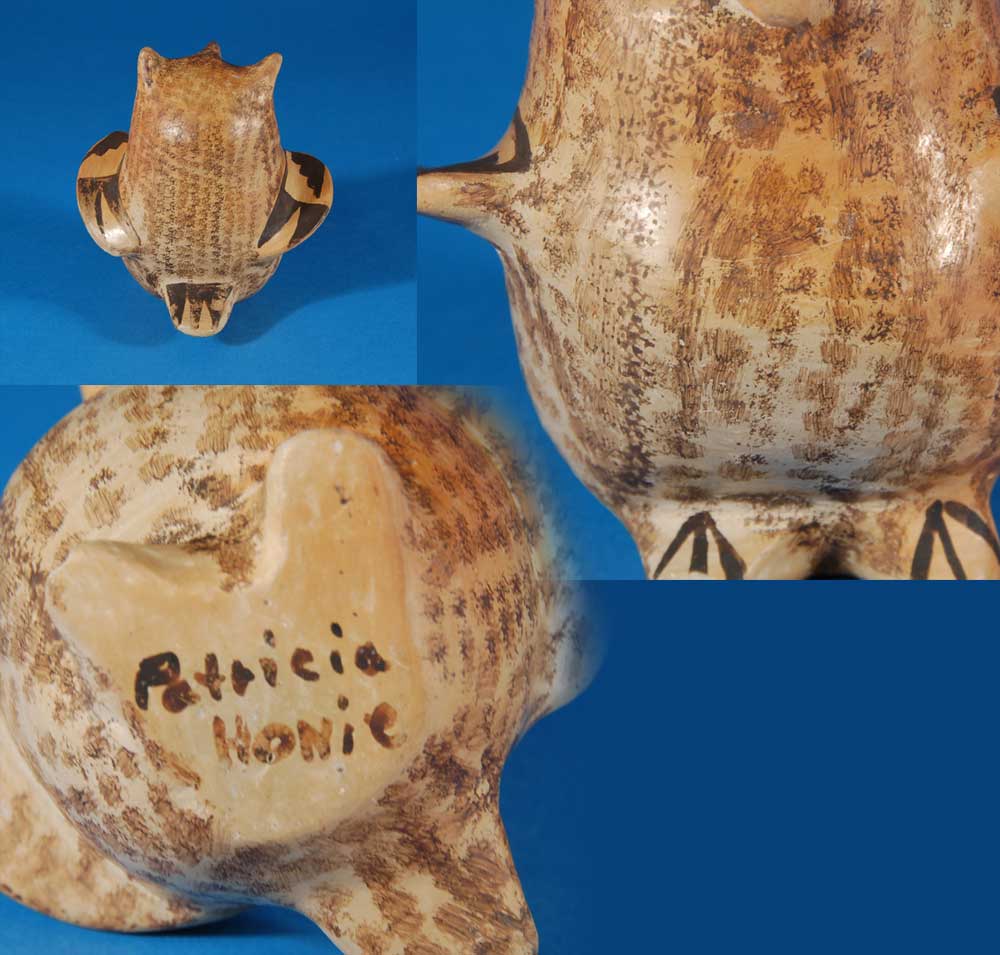 Rarely have I seen owl figurines from Hopi potters. I cannot verify that they are relatively rare but I do not recall often seeing them. This one is typically Hopi in construction and materials and is clearly signed by the artisan. It has wonderful wide eyes and wings spread as if ready for flight. It is in excellent condition.