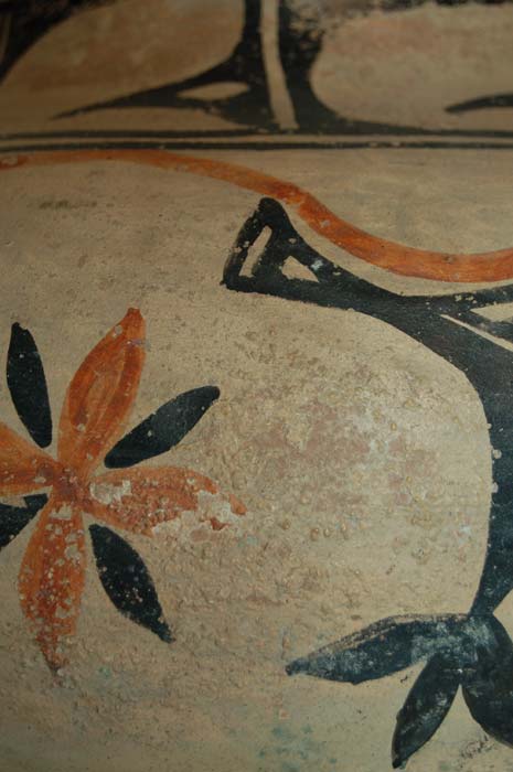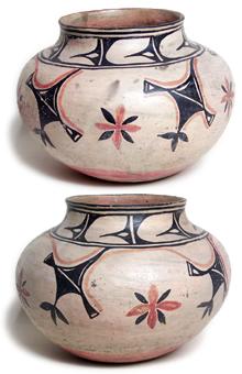 The design is divided into two distinct bands. First, the “tulip” design around the neck is often associated with Santo Domingo Pueblo, but was frequently used in 19th century Kiua pottery. The main body design is more reminiscent of Cochiti designs. The black cloud-like elements, suspended from the shoulder framing line, are seen on Cochiti vessels of later date.