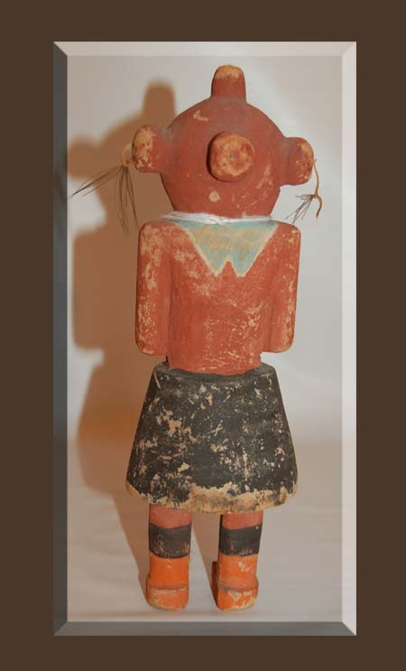 This Mudhead appears to be an early one, possible as early as 1930. It is painted with mineral paints. The arms are attached to the torso, and the entire doll is carved from cottonwood root. The simplicity of the carving is a good indication of its age.