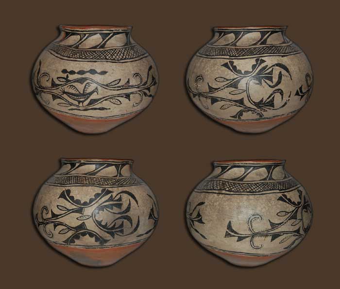 In this olla, we see an object combined with the artist’s subjective response to it—a union of material and technique both symbolic and intelligible. This potter has applied to the painting of the pottery the discipline of line and technique developed through many centuries of decorating every imaginable object of daily or sacred use with designs innately suited to the objects decorated and charged with traditional cultural concepts.