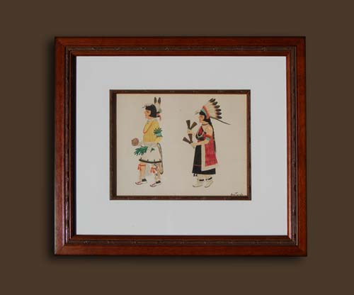 This painting is a good representation of his “representational style,” in which he usually painted pueblo religious or ceremonial scenes—in this case two dancers. There is no background scenery nor is there any hint of a ground plane. The two dancers are alone on the paper.