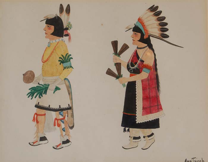 Awa Tsireh was painting before 1917. He was the oldest of the early group of pueblo painters. His formal education had not extended beyond primary grades. He was versatile in his styles of painting. He was equally comfortable with representational or semi-realistic, representational plus conventional, and abstract.