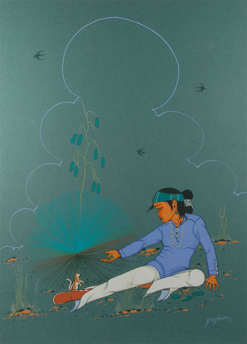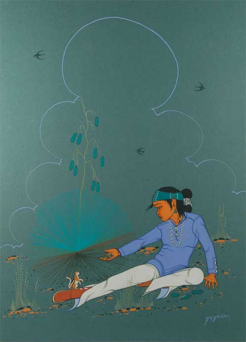 It is with this memory that Yazz has portrayed the lives of young Navajo boys in his paintings. In this one, a young Navajo boy is sitting around enticing a squirrel to eat from his hand. This is, quite possibly, something Yazz personally did. If not, he probably knew young boys who did.