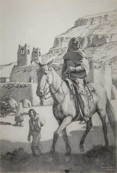 This marvelous drawing by Hernando Villa appears to portray a Taos Pueblo man on horseback either arriving at or departing from a village—Taos Pueblo or another village. The blanket wrapped around the head and draped over a shoulder is typical Taos Pueblo style. Additionally, the fringed buckskin trousers are typical of Taos Pueblo clothing.