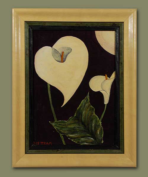 This painting is testimony to Bisttram’s influence by Diego Rivera and other Mexican artists who had a propensity for painting Calla lilies. The colors are bright and the paint applied with a heavy and steady hand.