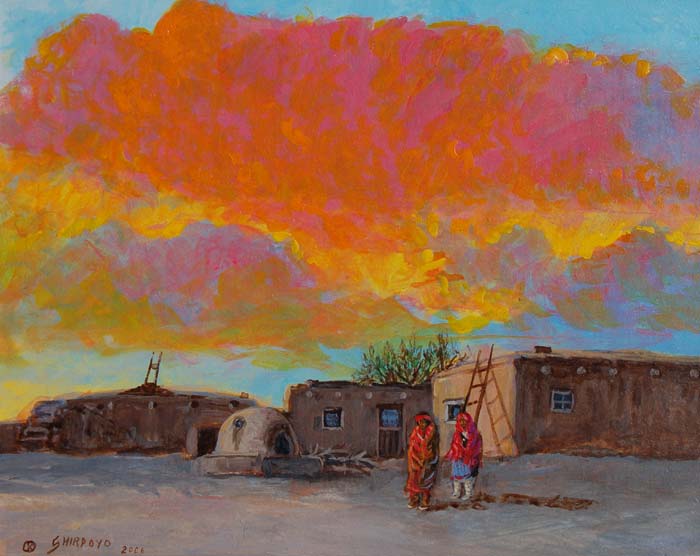 This is a very tranquil early evening scene at Isleta Pueblo, highlighting two Natives in their colorful blanket and manta, with a brilliant sunset behind them.
