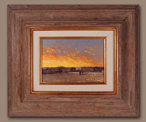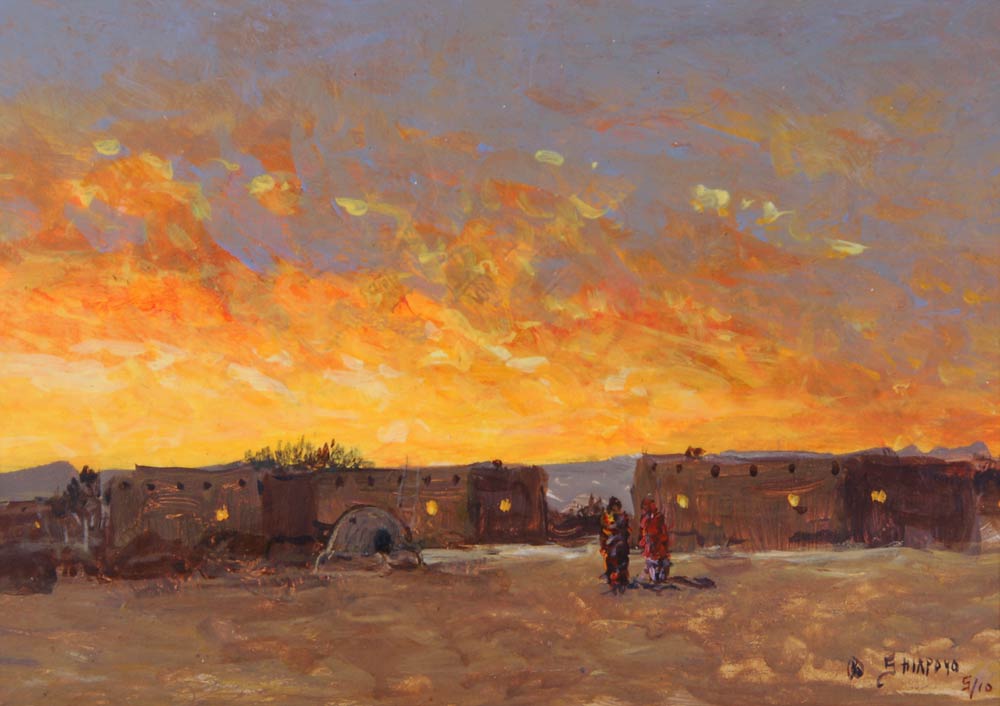 As a resident of Isleta Pueblo, Shirpoyo has often seen, first-hand, the beautiful, brilliantly orange and red New Mexico sunsets, which he expresses so well in this painting. Superimposed on a deep blue sky, it seems even more brilliant. The soft lines of the adobe buildings, the lights in the adobe homes, and one horno (oven) in the foreground compliment the activity in the sky. The color of the two woman wrapped in their blankets is a final touch he so expertly added. Signed and dated 5/10. Framed by the artist.