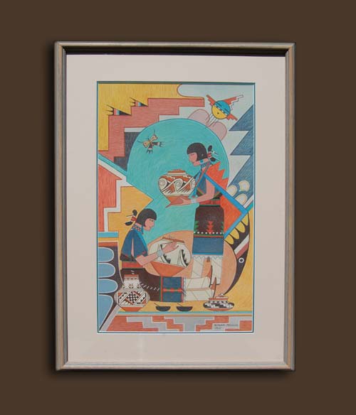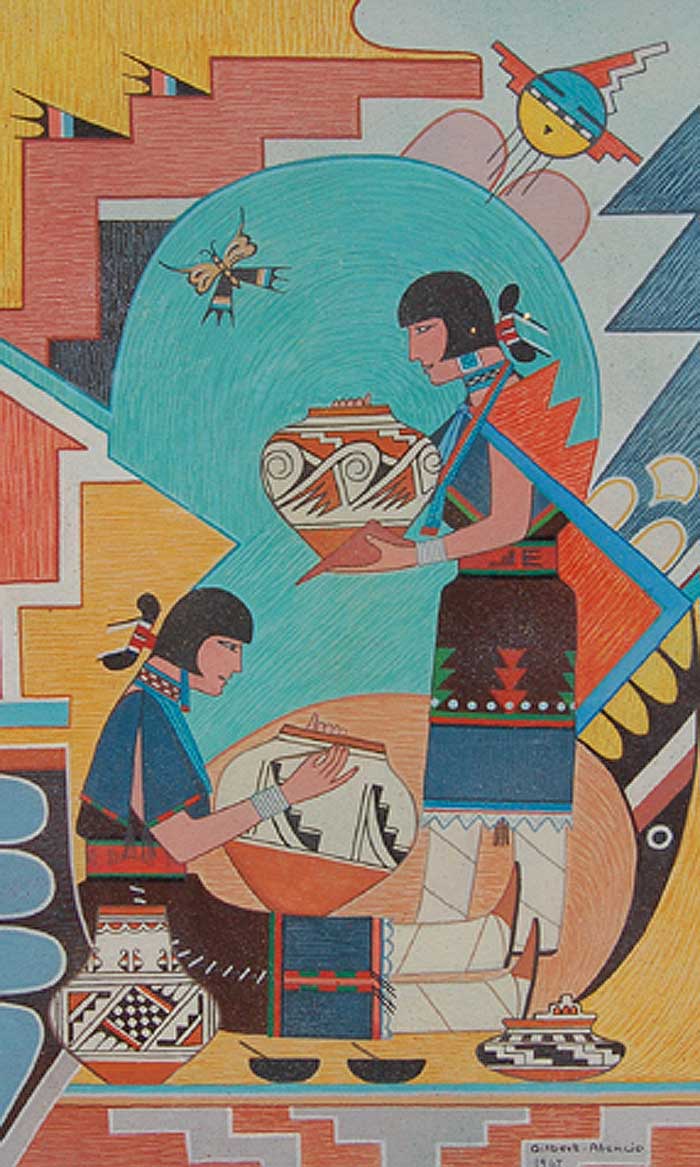 Gilbert Atencio, from San Ildefonso Pueblo, believed in the traditional Indian ways and his favorite subjects were ceremonies, ceremonial figures, and scenes from Pueblo life. Here he painted two pueblo women dressed in traditional pueblo clothing and jewelry and working on pottery. Beside and around them are items and symbols familiar to Pueblo Indians— bowls of paint, ceremonial terrace rim bowl, an olla, the Sun, a butterfly, a bird’s head and clouds.