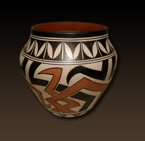 This is a traditional shape olla vessel with a non-traditional design that the artist calls a “tattoo design.” The construction of the vessel is traditional in all aspects.