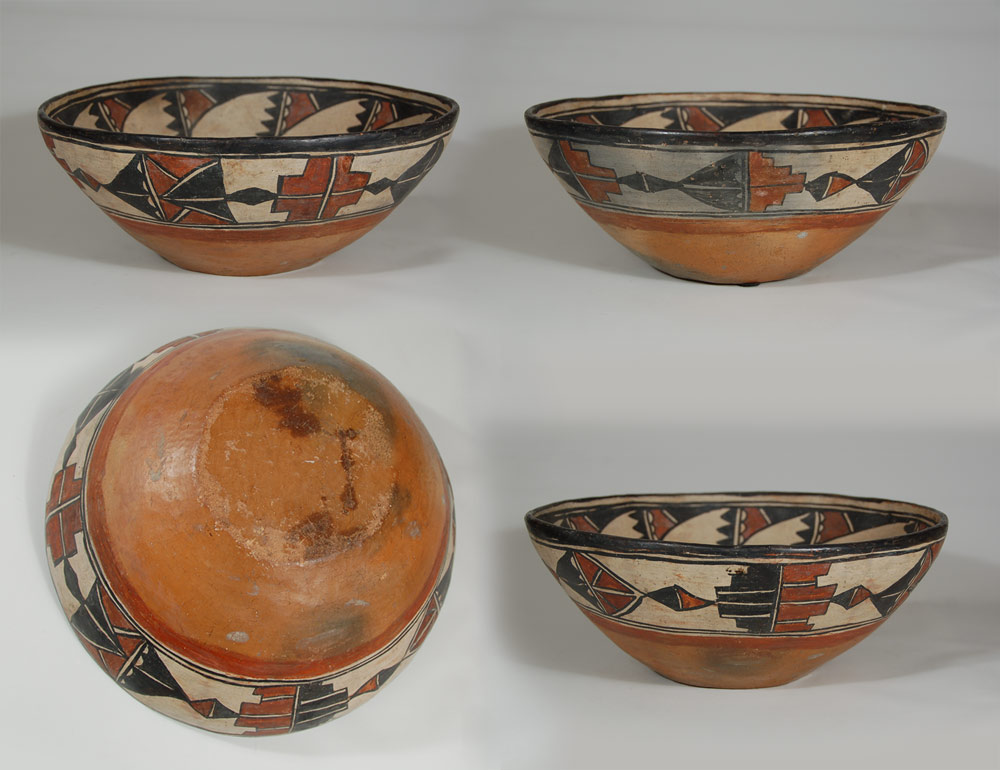 This is a turn-of-the-century polychrome bowl from San Ildefonso Pueblo that is totally slipped inside and outside with traditional Cochiti Pueblo rag-wiped white slip. The interior is decorated in a continuous chain of cloud forms, which are pendant from the lower of two parallel framing lines just below the rim.
