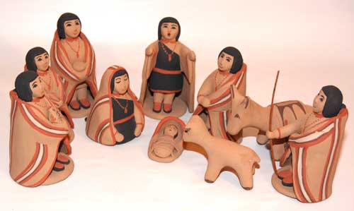 This Nacimiento set was made by Marie in the late 1980s and was purchased directly from her by the present owner. It is typical of the style she produced throughout her career. The paint is all natural and left in a matte state. Later in her career, Marie stone polished portions of the paint, but her early works were in a matte finish.