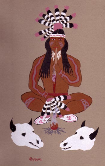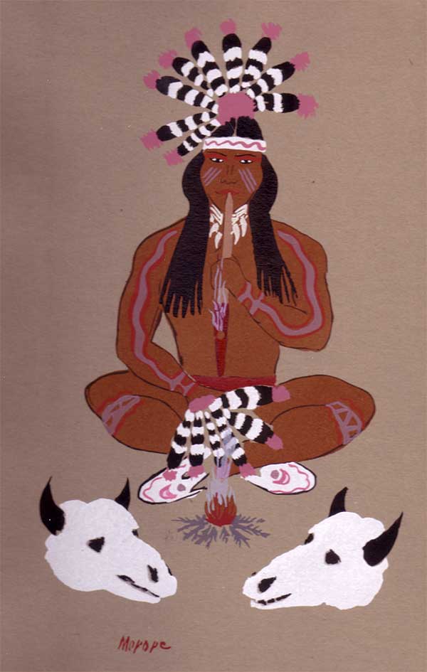 “Mopope’s grandfather was a Spanish captive, kidnapped by the Kiowas from a wagon train crossing the prairie and reared by Chief Many Bears. On the Kiowa side he was a descendant of Appiatan, a noted Kiowa warrior. His granduncles were Silverhorn (Haungooah) and Hakok. They found him drawing designs in the sand and decided to teach him how to paint on tanned skins in the old Kiowa way. Mopope’s childhood education by his grandmother was in the Kiowa tradition. He is one of the original Kiowa Five and was primarily a painter and dancer most of his life.”