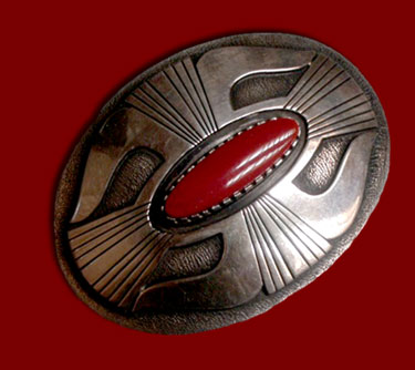 In this buckle, he applied a designed cut–out oval silver piece over a textured solid silver oval disc. In the top level of the overlay, he incised lines that radiate from the center outward. In the center, he mounted an extraordinary deep red coral stone that is beautiful beyond description. His name KEE NEZ and STERLING are stamped on the back.