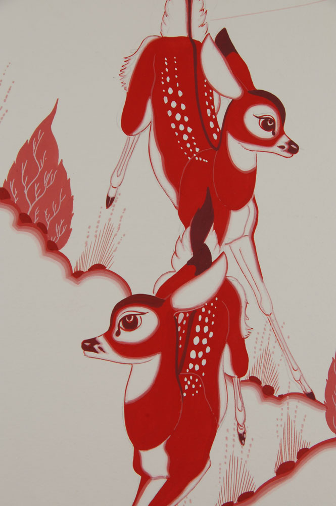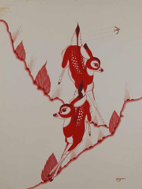 Deer are a motif that Yazz utilized in a great many paintings. In this piece, two deer are trotting down a very steep hillside. The use of maroon and pink give this painting a very contemplative feel.