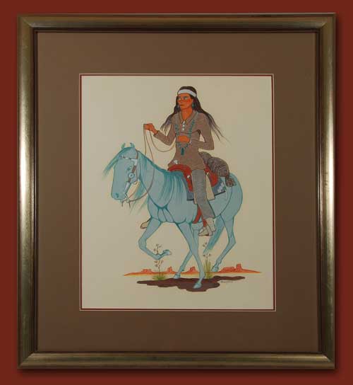 Here, he reflected the peaceful moment of a young Navajo man slowly plodding along on his blue horse. They do not appear to be harried or worried, but happy to be together. The horse is presented with great elegance in his solid blue color. The overall feel of the painting reflects the tranquility of life on the reservation.