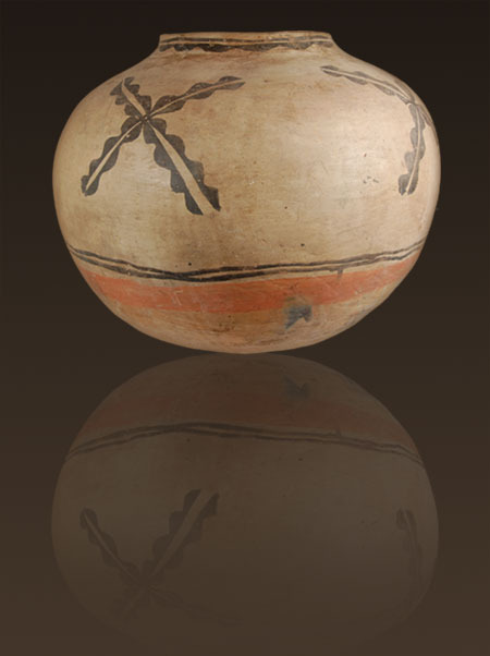 A wide red band was wiped over the unslipped stone-polished underbody. Although the jar shape would suggest a 1880s date, the simplicity of design suggests a date closer to 1860s.