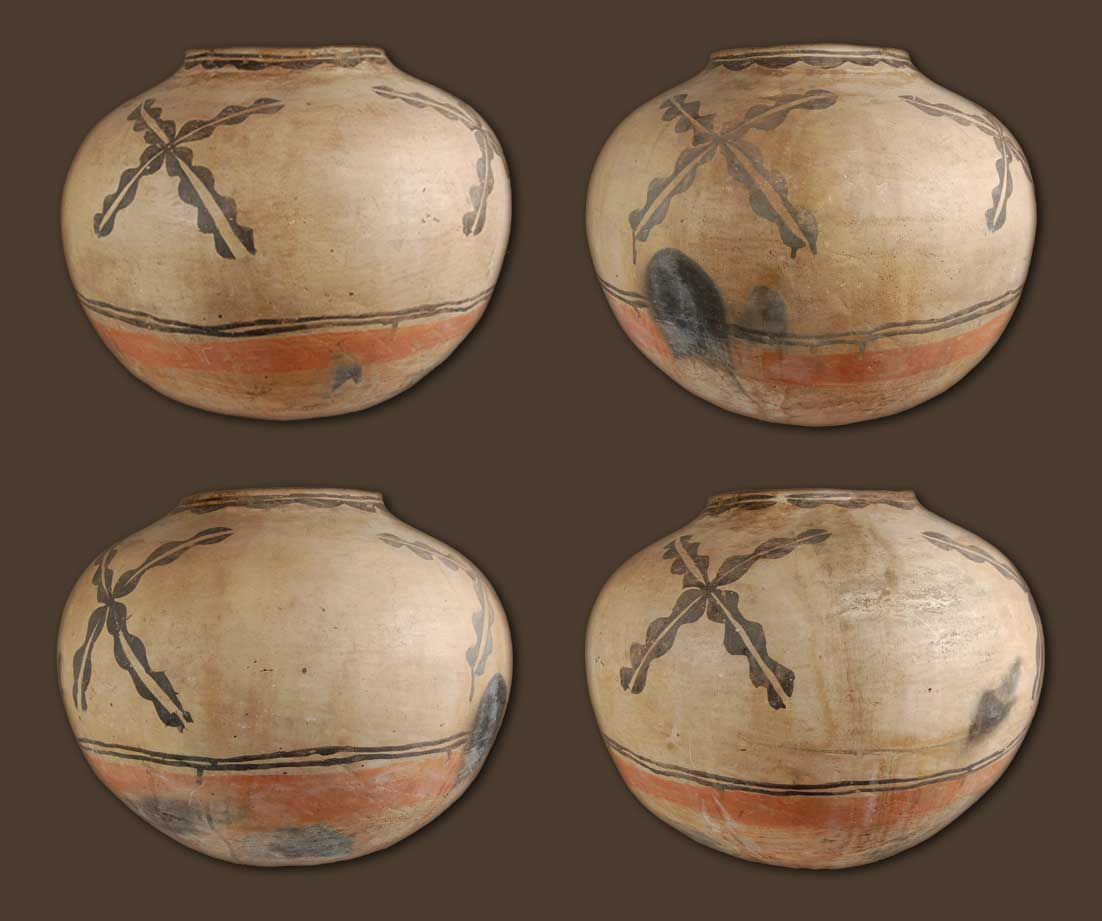 The jar is in excellent condition considering its age. It is an impressive piece of early Cochiti Pueblo history and we are fortunate in this day to have the opportunity to own it even for a short time. Jars of this nature are mostly in museum collections now so it is particularly appreciated that this one has been preserved and is now available for another collector to assume the task of protecting it from loss. Lucky is the one who is fortunate to be the next owner.