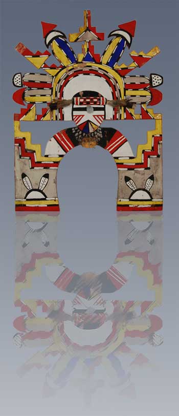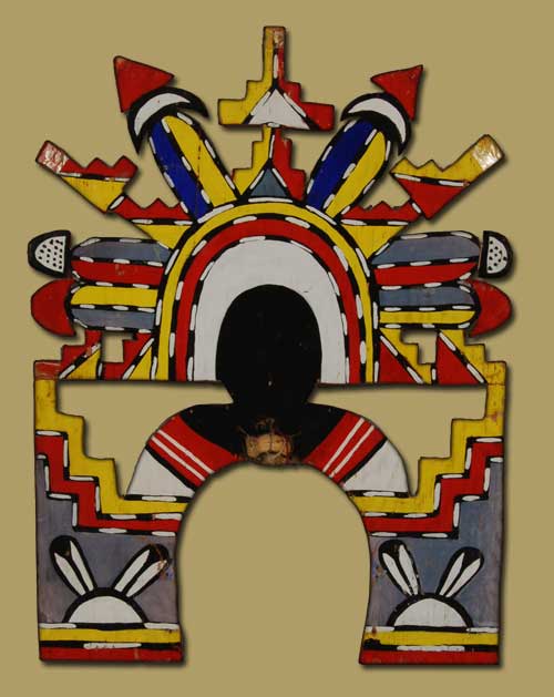 This Tablita decorated with the image of the Hopi Palhikmana Katsina is worn by a female during a dance following the Katsina dance season. The Tablita is covered with rain symbols, the rainbow on her chin being one. This was actually purchased by the owner in 1960 from the village of Shungopavi.