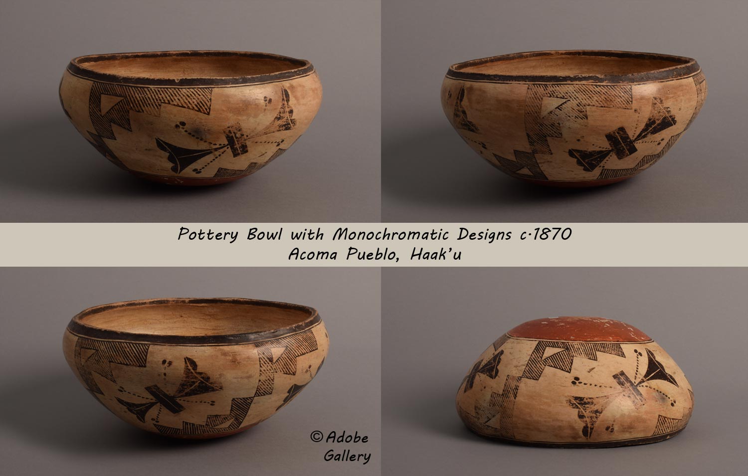 Provenance: This Acoma Pueblo Pottery Bowl with Monochromatic Designs c.1870 is from the collection of a client of Adobe Gallery.