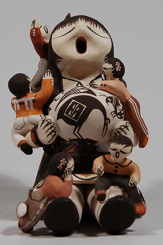 The artist is an excellent potter and painter and has consistently won awards since 1980 at the New Mexico State Fair, Santa Fe Indian Market, Eight Northern Pueblos Arts & Crafts, and the Heard Museum. This storyteller figurine well demonstrates why she is an award winner year after year.