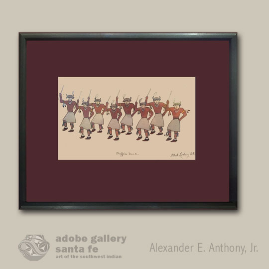 This beautiful and unusual depiction of a pueblo Buffalo Dance was created by Taos Pueblo painter Albert Looking Elk Martinez. The artist and two notable Taos Pueblo peers are known for creating works that varied greatly from those being produced at neighboring New Mexico Pueblos. With this piece, Martinez landed somewhere in the middle. “Buffalo Dance” is similar in subject and spirit to the “flat style” paintings of the other early pueblo artists, but somewhat different in execution.