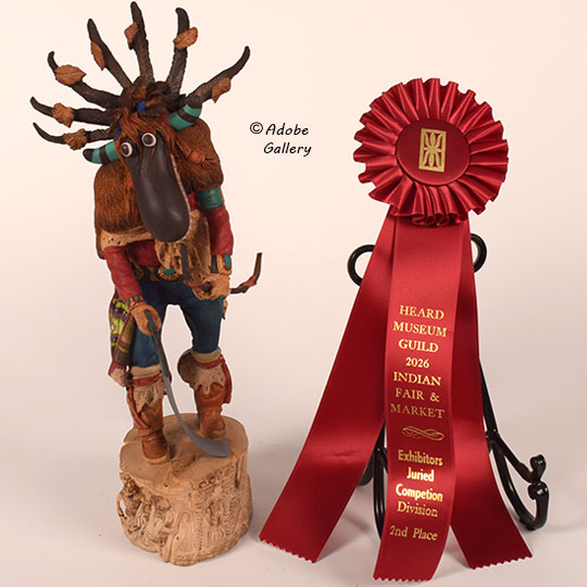 Kevin Pochoema entered this masterful one-piece carving into the 2026 Heard Museum Guild Indian Fair and Market in Phoenix, where it earned the prestigious Second Place award in the Juried Division. The result of months of meticulous labor, the piece captures a striking moment of Hopi tradition.