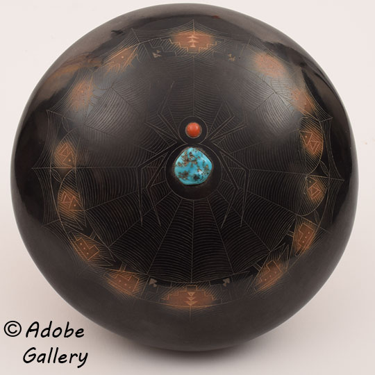 This polished black and sienna jar, created in 1982, has an intricate spider web on the domed top. Near the edge of the web, the potter inscribed small designs which are highlighted by the sienna color. There are adobe buildings, clouds, kiva steps and several incised small arrowheads inset within the web. The center of the dome features a large spider with coral for the head and turquoise for the body. The bottom of the jar is stone polished and signed with Barbara's Tewa name — Tahn Moo Whe, below which is inscribed three clouds and the number 3 and year 82.