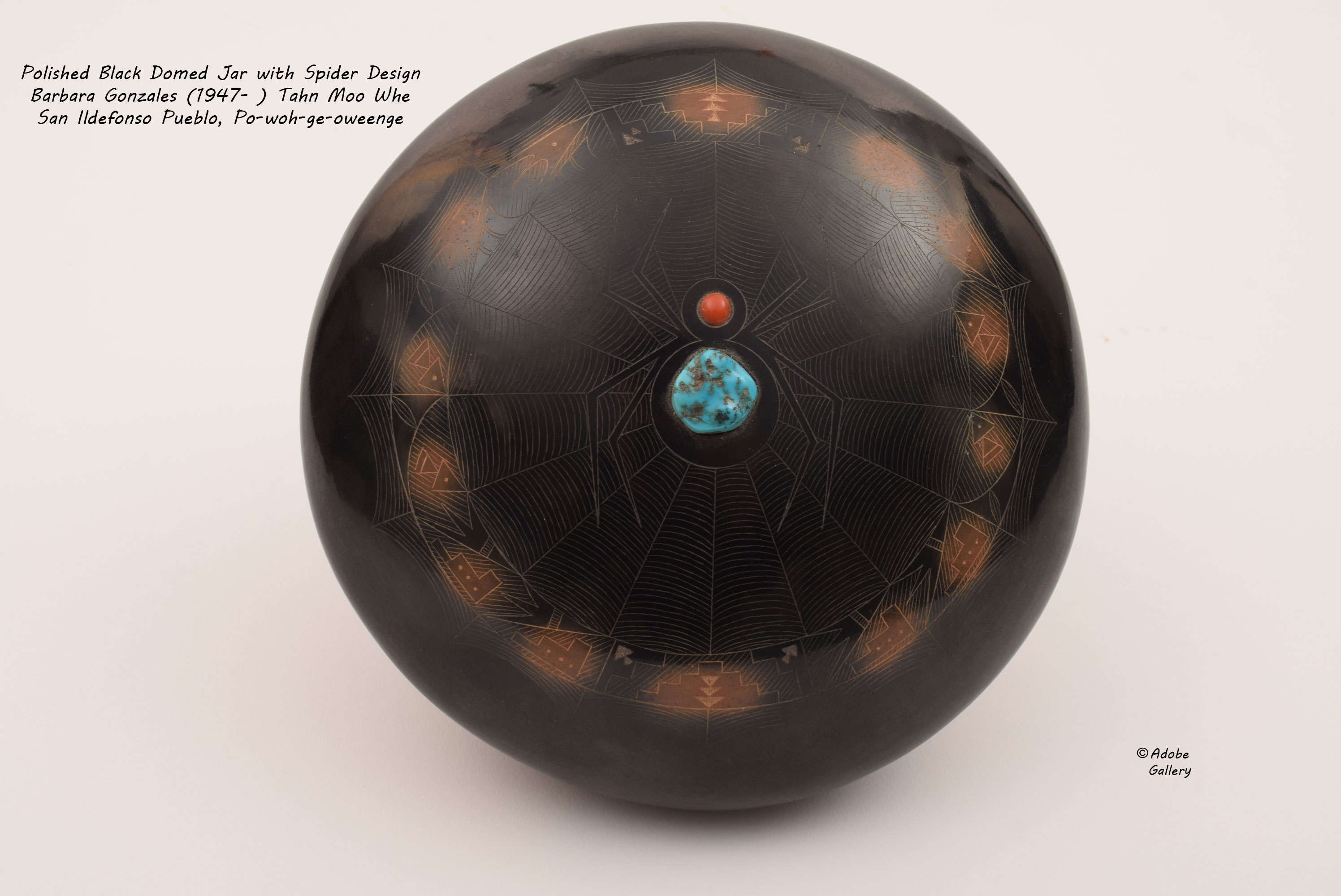 Barbara Gonzales (1947- ) Tahn Moo Whe is an excellent potter and an extension of her famous great-grandmother, Maria Martinez, and her grandparents, Adam and Santana Martinez. Her mother, Anita Martinez, was also a potter. Drawing on the traditions of her family, she expanded this tradition by personalizing her pottery with inlaid coral and turquoise on etched black and sienna wares — often inlaid on spider designs which she created in 1973. Early in her career she occasionally made plain black polished pottery, but no longer does so, nor does any other potter from San Ildefonso Pueblo.