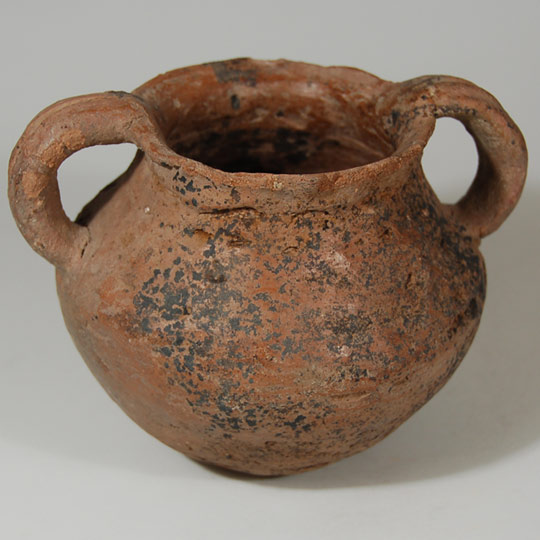 The shape of this small jar is very traditional to Casas Grandes utilitarian wares. The bottom is round and the body is globular with a constricted neck and flaring rim. Two handles connect the rim with the shoulder of the jar.