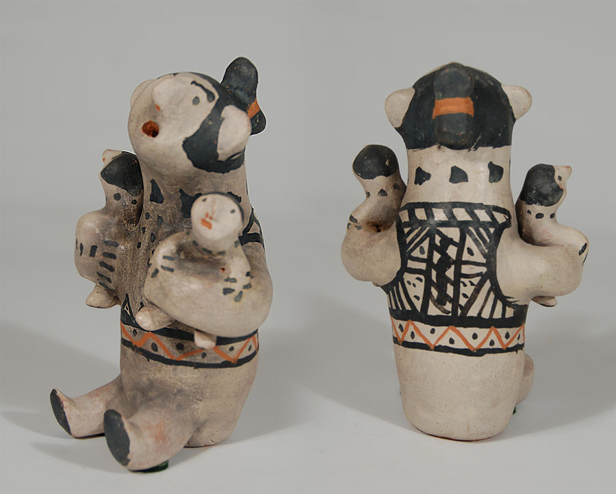 Touches of red paint were used for the mouths and nostrils of the three, for the concha belt and for the belt tying the chonga hairstyle on the adult. The adult has a design on his back that resembles a vest but it does not extend to the front as a vest would. The figurine is signed in pencil Damacia Cordero.