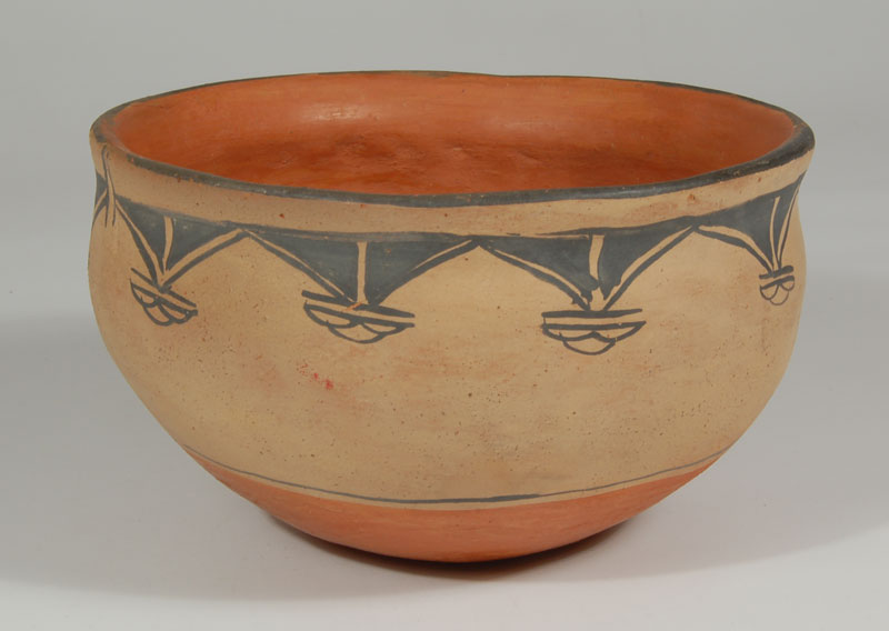 The design is typically a rain cloud presentation seen on many Cochiti vessels. Cochiti is one of the pueblos which has no restriction on using water symbols on secular pottery. Their neighbor, Santo Domingo, strictly forbids use of such on its pottery. It is estimated that the bowl dates to the end of the historic period, circa 1940s, or early in the contemporary period, post 1940s.