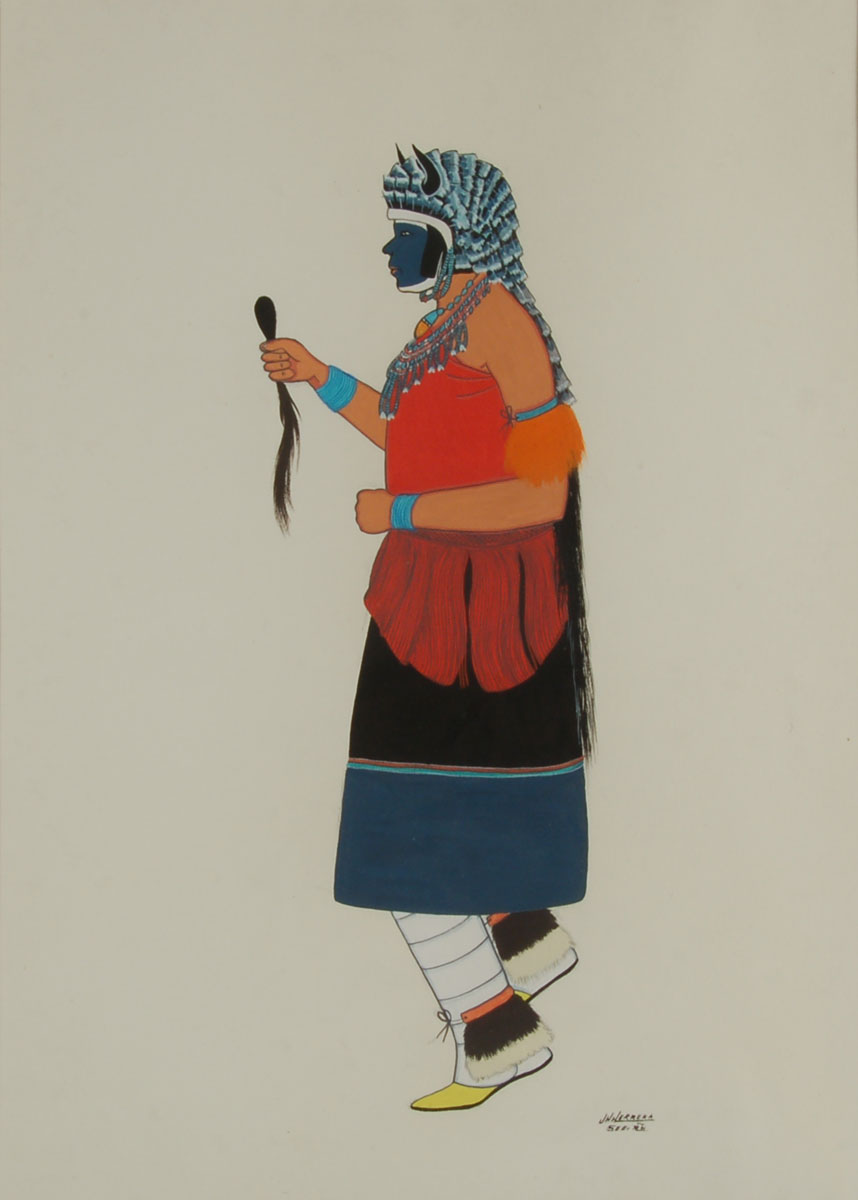 This painting is an early one by Herrera. It is of the female buffalo dancer. A note in pencil on the back of the painting states “This female dancer precedes The Buffalo Dancers and ‘Turtle Woman’ in the Cochiti Buffalo Dance. The object in her hand is the buffalo’s tail.”