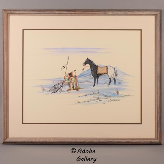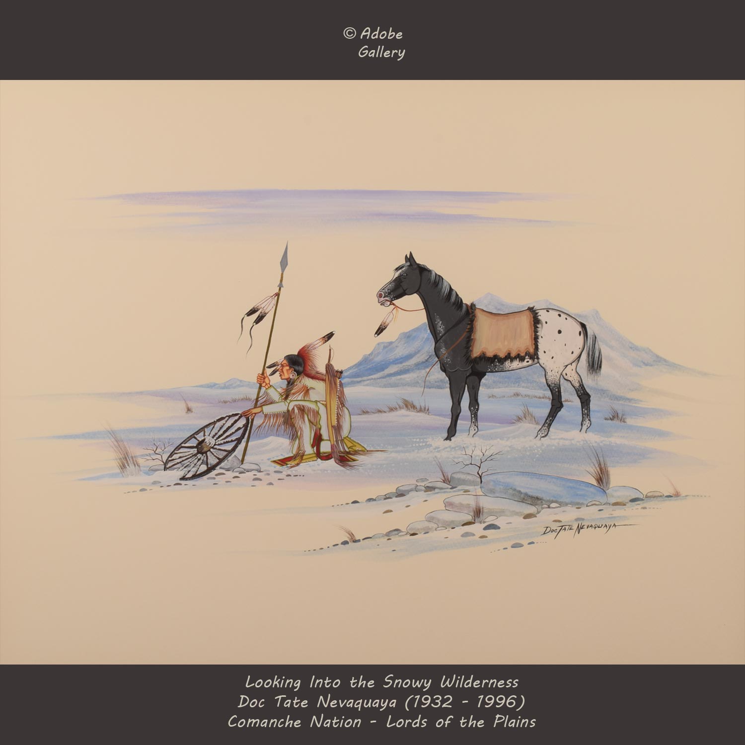 Set against a snowy, mountainous backdrop, this extremely profound work by Comanche artist Doc Tate Nevaquaya evokes a strong sense of tranquility. Nevaquaya had a gift for adding a strong depth of feeling into his paintings, and here the viewer can almost feel the bone chilling air around the scene.