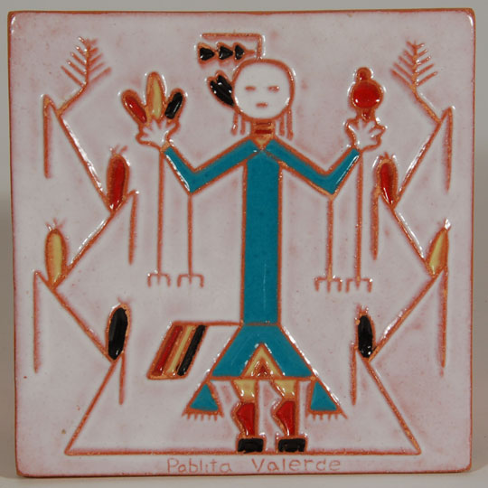 We would not normally feature a commercially molded pottery tile on our site but this one is being presented because it features an image made by Pablita Velarde who authorized its use for a commercial tile. At least a half dozen images by Pablita have been used for similar tiles.