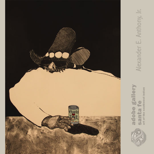 “The figure of the leering Indian, wearing dark glasses and a wide-brimmed hat, sits leaning on a bar. Set forth abstractly in bold areas of black, buff, and gray, the figure contrasts sharply with the concreteness of the beer can. Drawn and printed in full color, the beer can is real, the Indian an apparition… Among all of Scholder’s images, Indian at the Bar is one that most bitterly haunts the memory. There was no question as to its place in Indians Forever.” - Fritz Scholder Lithographs by Clinton Adams