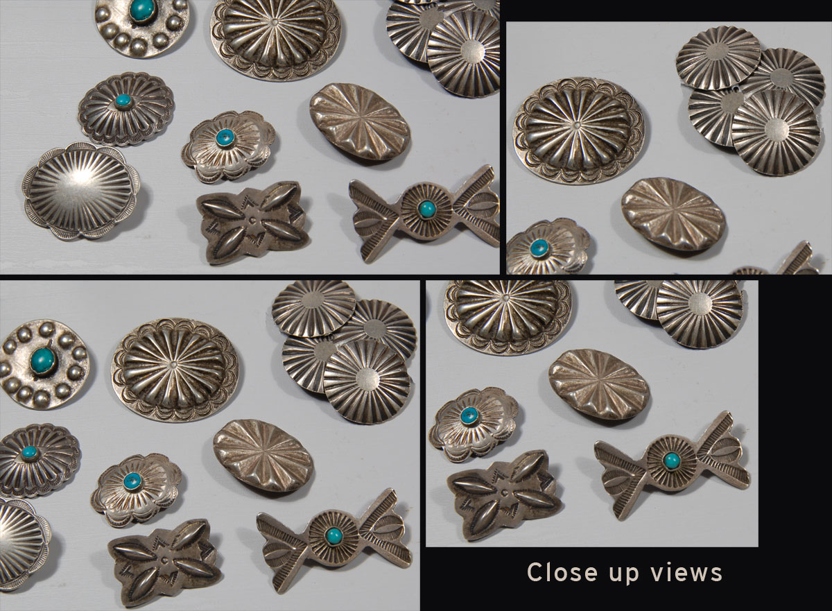 In this group of Navajo-made buttons, there is one set of four that match and all the others are single. Four have a single turquoise stone and the other buttons are silver only.