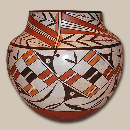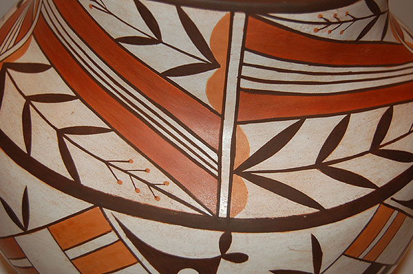 This jar is one of the most beautifully balanced and exquisitely shaped vessels the artist has brought to us. The rounded body and high shoulder provide an excellent area for displaying the decoration. The design includes bird features on the main body and corn plants on the neck area. The square boxes contain split rectangular elements that are a hallmark of Laguna Pueblo historic vessels.