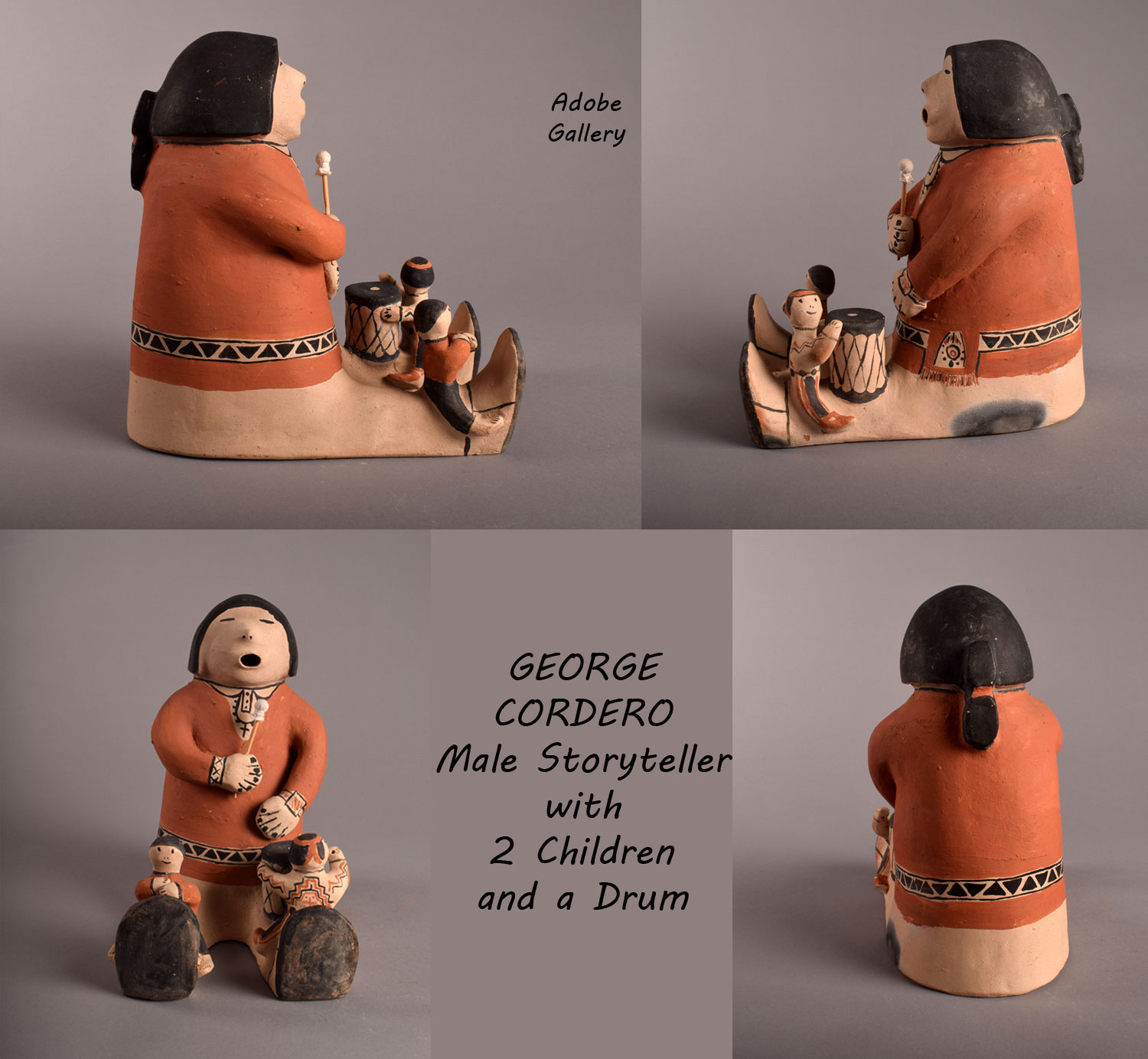 Provenance: This George Cordero male storyteller with two children and a drum was originally acquired by Adobe Gallery in 1999 from a private individual and subsequently sold to the current owners. It was likely created in the 1980s, during a period when George Cordero was actively producing pottery.