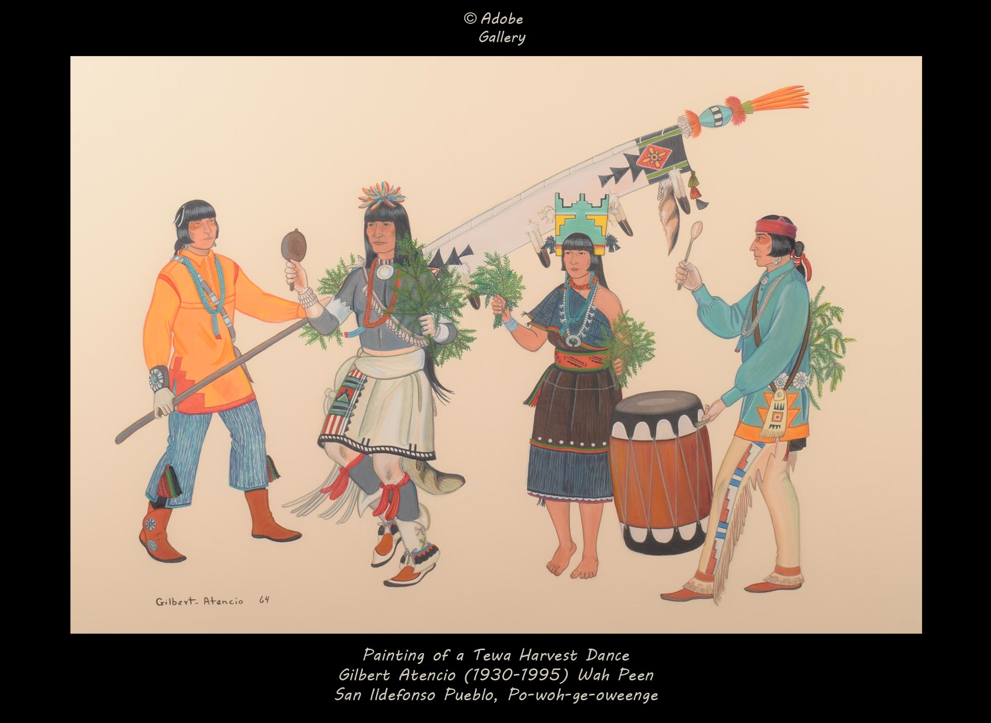 A short time before the Fall Equinox the Tewa Pueblos of New Mexico begin preparations for their annual Harvest Dance, signifying the end of the agricultural season. Generally, all members of the pueblo will participate. In this painting, Gilbert Atencio (1930-1995) Wah Peen shows us four members of the dance — only a portion of the large group of dancers but it illustrates the important banner carrier, drummer, and a male and female dancer. Other members of the dance would be like the male and female shown here.