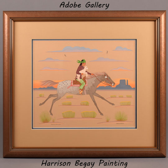 The painting is signed Haskay Yahne Yah in lower left and Harrison Begay in lower right. It is framed under conservation glass, with matting that matches the paper’s color and a textured wood frame with gold interior bands.
