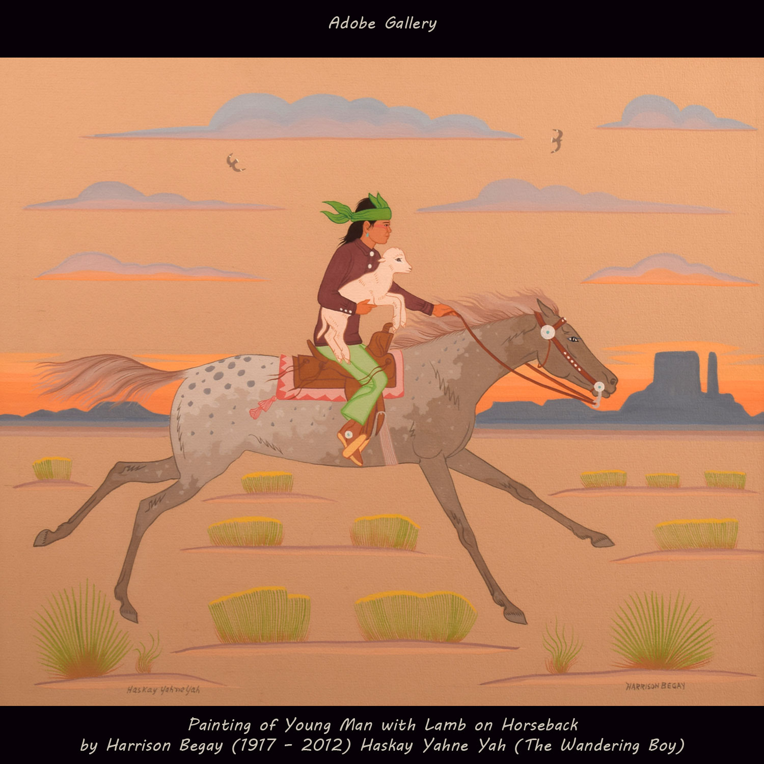 Provenance: this Harrison Begay Painting of Young Man with Lamb on Horseback is from the collection of a family from Arizona