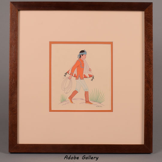 Begay is known for crisp detail in his appealing figures, and this example is strong in that regard. The painting’s signature—“H. Begay”, with no appearance of his native name—matches that which we’ve seen mostly on early-career pieces. The man’s face looks similar to those which we’ve seen in earlier works, too, so this piece might fall within that category. Whatever the case may be, it is a sweet and beautiful image.