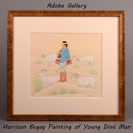 The painting is signed Harrison Begay in lower right. It is framed beautifully, using an off-white mat and a wood frame.